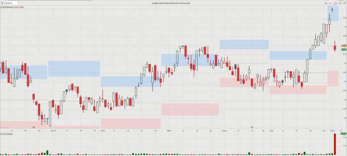 -- Jumbo: Πέρασαν χθες τα πακέτα του placement, όπου τελικώς ο επικεφαλής αποφάσισε να διπλασιάσει το πακέτο από 2 στα 4 εκατ. μετοχές, ήτοι από 1,5% στο 3% του μετοχικού κεφαλαίου. Η πώληση έγινε με σημαντικό discount 9,3% έναντι του προχθεσινού κλεισίματος που ήταν στα 30 ευρώ, καθώς η τιμή ορίστηκε στα 27,20 ευρώ και τα έσοδα έφτασαν τα 110 εκατ. ευρώ. Η μετοχή ακόμη και στο υψηλό ημέρας έχανε 5,73%, έφτασε έως το -7,73% για να κλείσει στα 27,80 ευρώ με πτώση 7,33%. Η Jumbo διακίνησε συναλλαγές αξίας 140,6 εκατ. ευρώ, ήτοι το 50% του συνολικού τζίρου της αγοράς. Η εταιρεία αποτελεί μηχανή... κοπής χρήματος και τα τελευταία χρόνια κάθε γύρισμα αποτέλεσε χρυσή ευκαιρία για τοποθετήσεις.