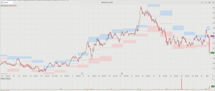 Ναι, είχε ταλαιπωρηθεί πολύ η μετοχή της Metlen, είχε κάνει συσσώρευση, προσπάθησε να τη διασπάσει ανοδικά και τελικά τη διέσπασε πτωτικά. Δεν αποκλείεται η ταλαιπωρία να συνεχιστεί, αλλά αυτήν την περίοδο και μετά από τέτοια άνοδο, δεν υπάρχουν πολλές μετοχές που να έχουν αξιόλογο περιθώριο ανόδου.