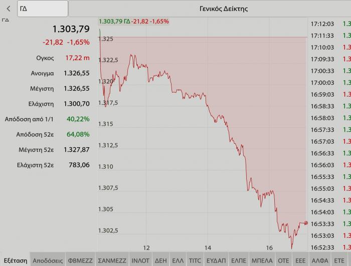Καιρό είχαμε να δούμε μια καθαρόαιμη διόρθωση και μάλιστα με κλείσιμο στο χαμηλό ημέρας, γεγονός που δίνει πόντους σε όσους προβλέπουν περαιτέρω υποχώρηση. Ο Γενικός Δείκτης έκλεισε στις 1.303,65 μονάδες σημειώνοντας απώλειες -1,65%, με την Coca Cola HBC και τις τράπεζες να δέχονται τις ισχυρότερες πιέσεις, πτώση που σήμερα θα θέσει σε δοκιμασία το όριο των 1.300 μονάδων.