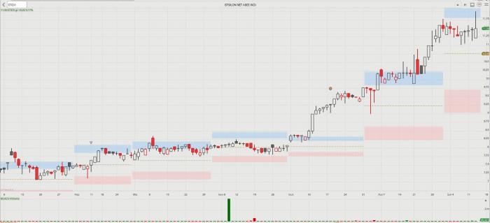 -- Epsilon Net: Η εταιρεία ξεχωρίζει. Πέμπτη διαδοχική ανοδική συνεδρίαση – σε τέτοιο κλίμα – ενώ χθες έφτασε ενδοσυνεδριακά έως τα 12 ευρώ όταν ενισχύονταν έως 4,53%, που είναι νέα ιστορικά υψηλά. Τελικώς έκλεισε στα 11,50 ευρώ (+0,17%), μόλις 10 cents χαμηλότερα από τα 11,60 ευρώ που είναι το ιστορικό υψηλό σε κλείσιμο, από τις 30 Αυγούστου. Πάντως, είχε συνολική διακύμανση 6,79%. Αποτιμάται στα 623,3 εκατ. ευρώ, έχοντας αφήσει πίσω ΟΛΠ και ΑΔΜΗΕ που αποτιμώνται 545 και 496,4 εκατ. ευρώ αντίστοιχα.