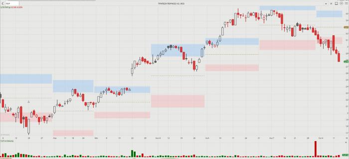 -- Τράπεζα Πειραιώς: Με απώλειες 10% το τριήμερο μετά την αναβάθμιση, έναντι -5,89% της Εθνικής, -4,08% της Alpha Bank και -3,61% της Eurobank. Είχε κάνει το μεγαλύτερο ράλι πρωτύτερα, έχοντας άκρως επιθετική τάση από τα χαμηλά του Ιουλίου 2022, όταν είχε κατέλθει στα 0,73 ευρώ, οπότε τώρα είναι εύλογο να έχει τις μεγαλύτερες απώλειες στον κλάδο. Ο τίτλος χθες διακίνησε το 1/5 των συνολικών συναλλαγών ήτοι 20,56 εκατ. ευρώ, κλείνοντας με πτώση 4,32% στα 2,79 ευρώ με όγκο 7,26 εκατ. τεμάχια. Η αποτίμηση έπεσε στα 3,48 εκατ. ευρώ. Από τα 3,51 ευρώ που έκλεισε την 1η Αυγούστου, υποχωρεί σε ποσοστό 20,51%. Κρατάει όμως κέρδη +94% το 2023, έναντι +49,19% της Εθνικής, +34,49% της Eurobank και +34% της Alpha Bank. Από τις 14 Ιουλίου 2022 και τα 0,73 ευρώ, κρατάει ράλι +282,19%.