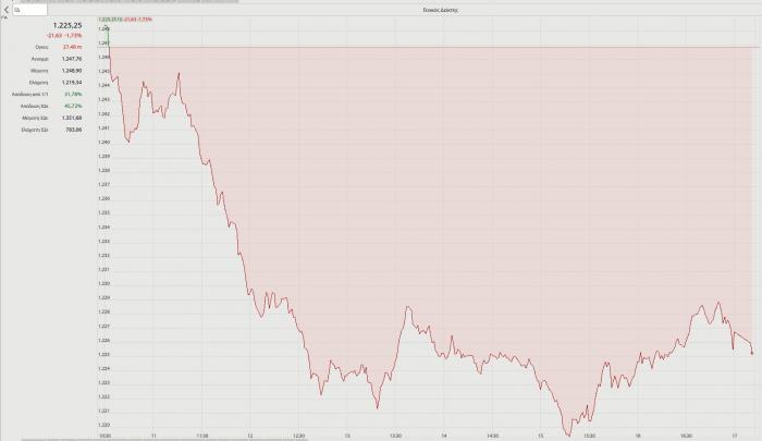 Το μόνο ενθαρρυντικό σημάδι, ίσως, ήταν ότι μόλις υποχώρησε -μετά τις 15.00- ο Γενικός Δείκτης κάτω από τις 1.220 μονάδες (στις 1.219,34) οι αγοραστές οδήγησαν σε μια μικρή θετική αντίδραση, που έφερε το τελικό κλείσιμο στις 1.225,25 μονάδες, με πτώση 1,73%. Αυτή η μικρή αντίδραση, πάντως, δεν είναι αρκετή για να διασκεδάσει τις κακές εντυπώσεις που άφησε η αγορά (και) στη χθεσινή συνεδρίαση.