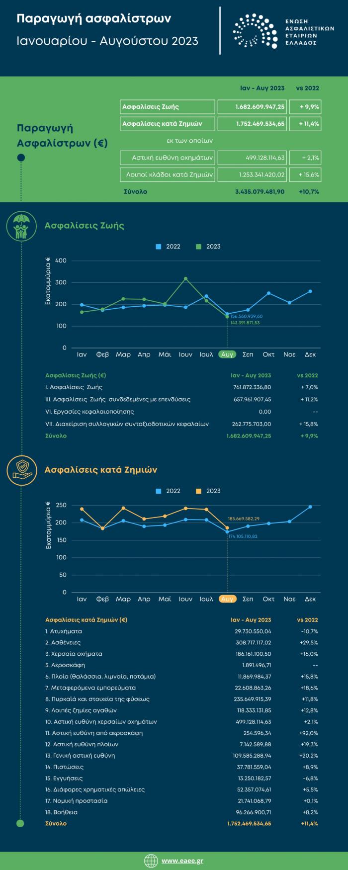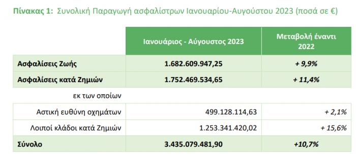 Στα 3,43 δισ. ευρώ διαμορφώθηκε η συνολική παραγωγή ασφαλίστρων στην ελληνική αγορά το οκτάμηνο Ιανουαρίου - Αυγούστου, καταγράφοντας άνοδο 10,7% σε σχέση με το αντίστοιχο διάστημα του προηγούμενου έτους, σύμφωνα με την έρευνα της Ένωσης Ασφαλιστικών Εταιρειών Ελλάδος (ΕΑΑΕ).