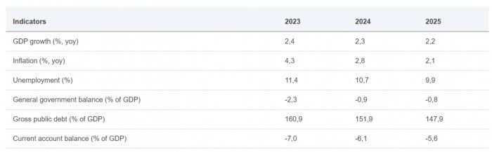 Η ανάπτυξη το 2024 θα φθάσει στο 2,3% και θα επιβραδυνθεί ήπια έως το 2,2% το 2025. Σε ό,τι αφορά τον Εναρμονισμένο Δείκτη Τιμών Καταναλωτή θα φθάσει φέτος στο 4,3% για να υποχωρήσει στο 2,8% το 2024 και στο 2,1% το 2025, με το χρέος να συνεχίζει να αποκλιμακώνεται και να διαμορφώνεται για το τρέχον έτος στο 160,9% του ΑΕΠ, για το 2024 να φθάνει στο 151,9% του ΑΕΠ και το 2025 να υποχωρεί στο 147,9% του ΑΕΠ. Το έλλειμμα της γενικής κυβέρνησης προβλέπεται να παραμείνει σε γενικές γραμμές αμετάβλητο το 2023, φθάνοντας το 2,3% του ΑΕΠ, ενώ το 2024 θα υποχωρήσει στο 0,9% του ΑΕΠ και το 2025 στο 0,8% του ΑΕΠ.