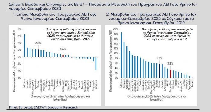 Για το σύνολο του 9μηνου Ιανουαρίου-Σεπτεμβρίου 2023, ο ετήσιος πραγματικός ρυθμός μεγέθυνσης διαμορφώθηκε στο 2,2%, ο 6ος υψηλότερος ανάμεσα στις χώρες της Ευρωζώνης και της Ευρωπαϊκής Ένωσης των 27 Κρατών Μελών (ΕΕ-27), ενώ σε σύγκριση με το 9μηνο Ιανουαρίου-Σεπτεμβρίου 2019 (προ πανδημίας επίπεδα), το πραγματικό ΑΕΠ στην Ελλάδα ήταν υψηλότερο κατά 5,8%, έναντι 3,3% στην Ευρωζώνη.