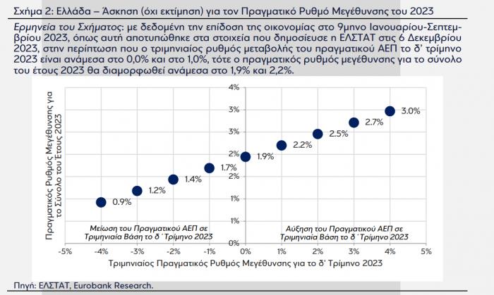 Η επίδοση της ελληνικής οικονομία στο 9μηνο Ιανουαρίου-Σεπτεμβρίου 2023 είναι ελαφρώς χαμηλότερη από την τρέχουσα μέση εκτίμηση της αγοράς για τον πραγματικό ρυθμό μεγέθυνσης του 2023 (2,3%). Με δεδομένη την επίδοση της οικονομίας στο 9μηνο Ιανουαρίου-Σεπτεμβρίου 2023, όπως αυτή αποτυπώθηκε στα στοιχεία που δημοσίευσε η ΕΛΣΤΑΤ στις 6 Δεκεμβρίου 2023, η επαλήθευση της προαναφερθείσας μέσης εκτίμησης της αγοράς ή ακόμα και των αντιστοίχων επίσημων εκτιμήσεων της Ευρωπαϊκής Επιτροπής (2,3%) και του Κρατικού Προϋπολογισμού 2024 (2,4%), συνεπάγεται σημαντική άνοδο του πραγματικού ΑΕΠ σε τριμηνιαία βάση το δ’ τρίμηνο 2023.