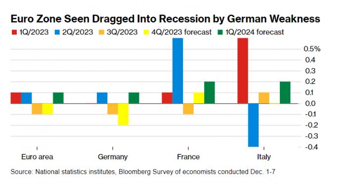 Η ευρωζώνη δεν θα αποφύγει την πρώτη ύφεση μετά την πανδημία, με την οικονομία της να συρρικνώνεται για δεύτερο συνεχόμενο τρίμηνο στο δ’ τρίμηνο του 2023, σύμφωνα με δημοσκόπηση του Bloomberg μεταξύ αναλυτών.