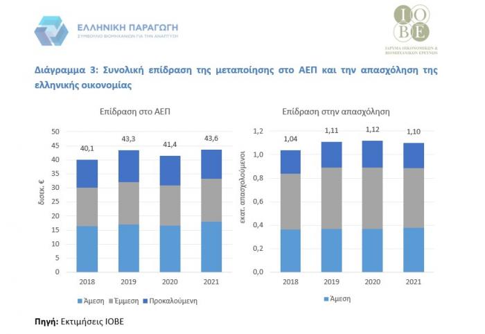 Η δραστηριότητα της μεταποίησης αποτελεί βασικό μοχλό οικονομικής ανάπτυξης της ελληνικής οικονομίας. Συνυπολογίζοντας τις έμμεσες και προκαλούμενες επιδράσεις από τη διασύνδεση με τους λοιπούς τομείς της οικονομίας, η συνολική συμβολή της εγχώριας μεταποίησης υπολογίζεται σε 24,0% του ΑΕΠ της χώρας το 2021. Σε όρους απασχόλησης, η επίδραση εκτιμάται σε 1,1 εκατ. θέσεις εργασίας το 2021. Η υψηλότερη συμβολή καταγράφεται στις περιφέρειες που βρίσκονται τα μεγαλύτερα αστικά κέντρα της χώρας (Αττική και Κεντρική Μακεδονία), ενώ ιδιαίτερα υψηλή για το μέγεθος της περιφερειακής οικονομίας είναι η συμβολή της μεταποίησης και στις περιφέρειες Στερεάς Ελλάδας, Δυτικής Μακεδονίας, Αν. Μακεδονίας-Θράκης, Πελοποννήσου και Θεσσαλίας.