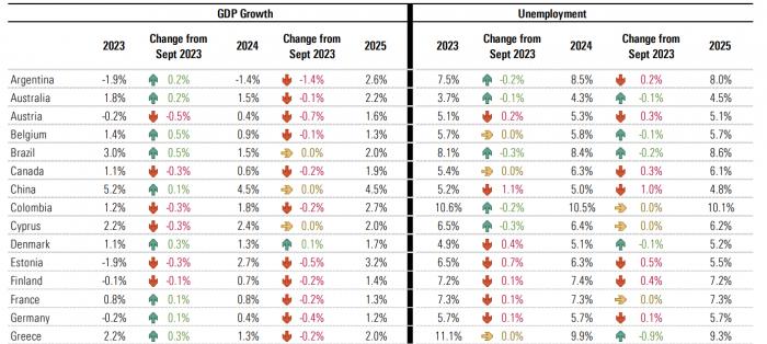 Αναφερόμενος στο σύνολο των οικονομιών τις οποίες καλύπτει σημειώνει ότι οι προοπτικές για το 2024 παραμένουν δυσοίωνες και οι προβλέψεις συνεχίζουν να επιδεινώνονται τους τελευταίους μήνες. Οι ΗΠΑ αποτελούν την κύρια εξαίρεση, με τις προβλέψεις να αναβαθμίζονται και να συγκλίνουν στο 1,2%.