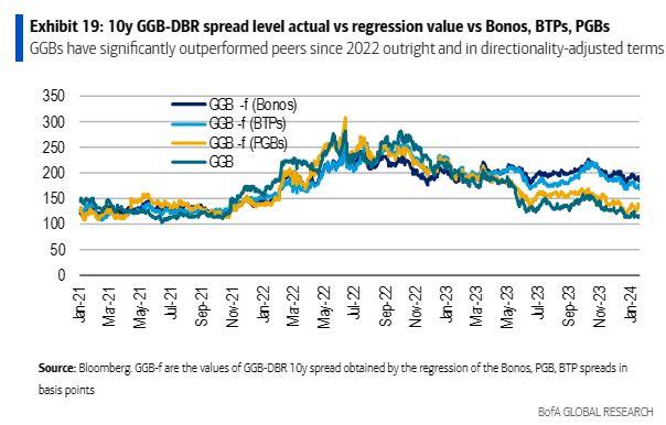 Σε αυτό το πλαίσιο, τα ελληνικά spreads επηρεάζονται πολύ λιγότερο από τις διακυμάνσεις του risk on/off, τονίζει και η BofA και περιμένει περαιτέρω συρρίκνωση κατά 30 μονάδες βάσης.