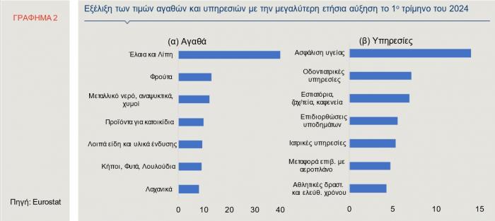Σε ό,τι αφορά στις επιμέρους κατηγορίες προϊόντων, το πρώτο τρίμηνο του 2024, τα αγαθά των οποίων οι τιμές κατέγραψαν τη μεγαλύτερη αύξηση ήταν τα έλαια και λίπη (40%), τα φρούτα (13%), το μεταλλικό νερό, τα αναψυκτικά και οι χυμοί φρούτων (12,3%), τα προϊόντα για κατοικίδια (9,8%), τα λοιπά είδη και υλικά ένδυσης (9,2%), τα προϊόντα κήπου και άνθη/φυτά (9,2%) και τα λαχανικά (8,1%) (Γράφημα 2α). Αντίστοιχα, οι υπηρεσίες που κατέγραψαν τη μεγαλύτερη αύξηση τιμών το πρώτο τρίμηνο φέτος, ήταν η ασφάλιση υγείας (14%), οι οδοντιατρικές υπηρεσίες (7,2%), οι υπηρεσίες εστίασης (6,9%), οι επιδιορθώσεις υποδημάτων (5,6%), οι ιατρικές υπηρεσίες (5,3%), η μεταφορά επιβατών με αεροπλάνο (4,4%) και οι αθλητικές δραστηριότητες και δραστηριότητες ελεύθερου χρόνου (4,3%) (Γράφημα 2β).