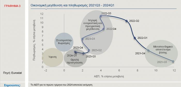 Η περιοριστική νομισματική πολιτική, σε συνδυασμό με την πτώση των τιμών της ενέργειας κατά το περασμένο έτος αλλά και τους πρώτους μήνες του 2024, οδήγησαν σε μία «ομαλή προσγείωση», δηλαδή, όπως παρατηρείται στο Γράφημα 3, σε μία περιοχή η οποία χαρακτηρίζεται από σχετικά ήπιο πληθωρισμό και αντίστοιχα ήπιους ρυθμούς οικονομικής μεγέθυνσης. Βάσει των τελευταίων διαθέσιμων προβλέψεων, η ελληνική οικονομία εκτιμάται ότι θα παραμείνει σε αυτήν την περιοχή τη διετία 2024-2025, με το ΑΕΠ να αυξάνεται με ρυθμό περί του 2,5% (Πρόγραμμα Σταθερότητας 2024, Υπουργείο Εθνικής Οικονομίας και Οικονομικών) και τον πληθωρισμό να προσεγγίζει σταδιακά το 2%.