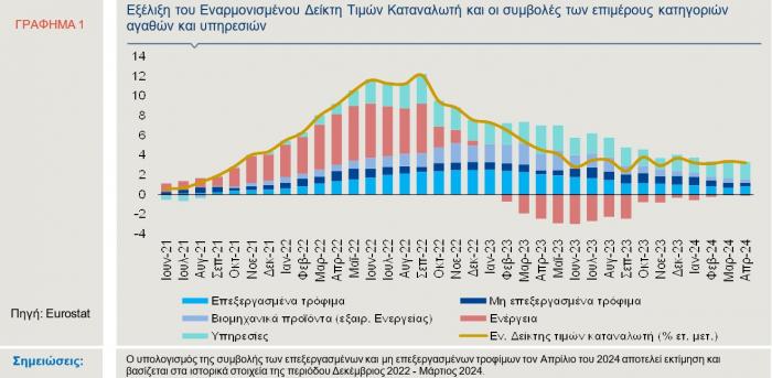 Επιπρόσθετα, οι τιμές των τροφίμων συνεχίζουν να αυξάνονται, αν και με φθίνοντα ρυθμό. Η συμβολή τους στην άνοδο του γενικού επιπέδου τιμών διαμορφώθηκε από 1,8 π.μ. τον Ιανουάριο, σε 1,2 π.μ. τον Απρίλιο. Από τις επιμέρους κατηγορίες, τα μη επεξεργασμένα τρόφιμα καταγράφουν υψηλότερες αυξήσεις τιμών (9%, το πρώτο τρίμηνο), γεγονός που πιθανά συνδέεται με τις καταστροφικές πλημμύρες στη Θεσσαλία, περιφέρεια η οποία είναι ιδιαίτερα σημαντική για την αγροτική παραγωγή της χώρας. Ο ρυθμός ανόδου των τιμών των μη επεξεργασμένων τροφίμων, ωστόσο, έχει υποχωρήσει σε σχέση με το δεύτερο μισό του 2023, διάστημα κατά το οποίο ξεπερνούσε το 10%. Οι τιμές των επεξεργασμένων τροφίμων αυξήθηκαν κατά 4,6% το πρώτο τρίμηνο, σε ετήσια βάση, από 13,2% το ίδιο διάστημα πέρυσι. Η συμβολή της ανόδου των τιμών τους, ωστόσο, στον πληθωρισμό, ήταν υψηλότερη σε σύγκριση με τα μη επεξεργασμένα τρόφιμα, καθώς η στάθμισή τους στον ΕνΔΤΚ είναι μεγαλύτερη.