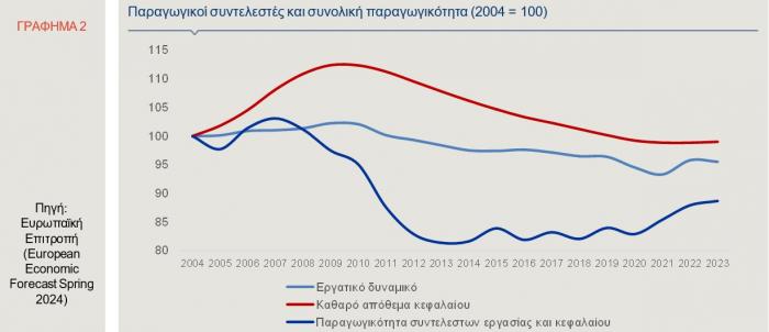 Η άνοδος του δυνητικού ΑΕΠ, την τελευταία διετία, προήλθε τόσο από την αύξηση των παραγωγικών συντελεστών, δηλαδή του κεφαλαίου και της εργασίας, όσο και από την άνοδο της συνολικής παραγωγικότητας (total factor productivity). Συγκεκριμένα, το απόθεμα φυσικού κεφαλαίου, το οποίο δέχτηκε σημαντικό πλήγμα κατά τη διάρκεια της οικονομικής κρίσης στη χώρα, καθώς οι επενδύσεις υπολείπονταν των αποσβέσεων με αποτέλεσμα τη διάβρωσή του, κατέγραψε οριακή άνοδο το 2023, για πρώτη φορά από το 2009 (Γράφημα 2).