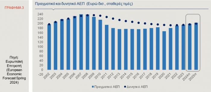 Σύμφωνα με τις πρόσφατες προβλέψεις της Ευρωπαϊκής Επιτροπής , το θετικό παραγωγικό κενό αναμένεται να διευρυνθεί τη διετία 2024-25, καθώς το δυνητικό ΑΕΠ θα αυξηθεί μεν (2024: 1,2%, 2025: 1,6%), αλλά ο ρυθμός αύξησης του πραγματικού ΑΕΠ (2024: 2,2%, 2025: 2,3%) θα είναι υψηλότερος. Επιπλέον, οι επενδύσεις εκτιμάται ότι θα συνεχίσουν να αυξάνονται, μεταξύ άλλων, με τη σημαντική ώθηση των ευρωπαϊκών πόρων του Ταμείου Ανάκαμψης, με αποτέλεσμα την άνοδο του καθαρού αποθέματος κεφαλαίου (2024: 0,4%, 2025: 0,8%). Η ενσωμάτωση στην παραγωγική διαδικασία νέων και καινοτόμων τεχνολογιών, παράλληλα, θα ενισχύσει και την παραγωγικότητα των συντελεστών παραγωγής, η οποία βάσει των προβλέψεων της ΕΕ θα αυξηθεί κατά 1,1% φέτος και 1,5% το 2025.