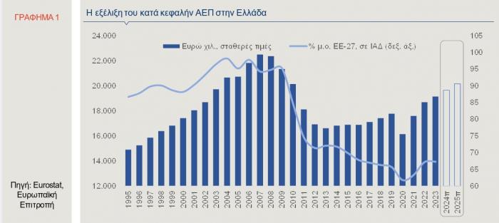 Στην έκθεση τονίζεται ότι το πραγματικό κατά κεφαλήν ΑΕΠ της Ελλάδας αυξήθηκε σωρευτικά κατά 18,6% την τελευταία τριετία και διαμορφώθηκε σε Ευρώ 19,2 χιλ. Αν και πρόκειται για την υψηλότερη επίδοση που έχει καταγραφεί από το 2010, εξακολουθεί να υπολείπεται σημαντικά των επιπέδων που είχαν καταγραφεί πριν από την οικονομική κρίση κατά περίπου 15% (Γράφημα 1).