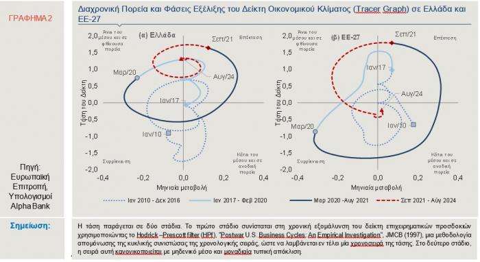 Η ανθεκτικότητα που επιδεικνύει η ελληνική οικονομία απεικονίζεται στο ιχνηλατικό (tracer) Γράφημα 2α. Συγκεκριμένα, το γράφημα απεικονίζει την κυκλική κίνηση του δείκτη ESI μεταξύ των τεσσάρων τεταρτημόριων που αντιστοιχούν σε διαφορετικές φάσεις του οικονομικού κύκλου, για το χρονικό διάστημα από τον Ιανουάριο του 2010 έως τον Αύγουστο του 2024. Οι φάσεις αυτές μπορούν να χαρακτηριστούν ως εξής: άνω του μέσου και σε αύξουσα πορεία (φάση επέκτασης, άνω δεξιά), άνω του μέσου και σε καθοδική πορεία (άνω αριστερά), κάτω του μέσου και σε καθοδική πορεία (φάση συρρίκνωσης, κάτω αριστερά) και κάτω του μέσου και σε ανοδική πορεία (κάτω δεξιά).
