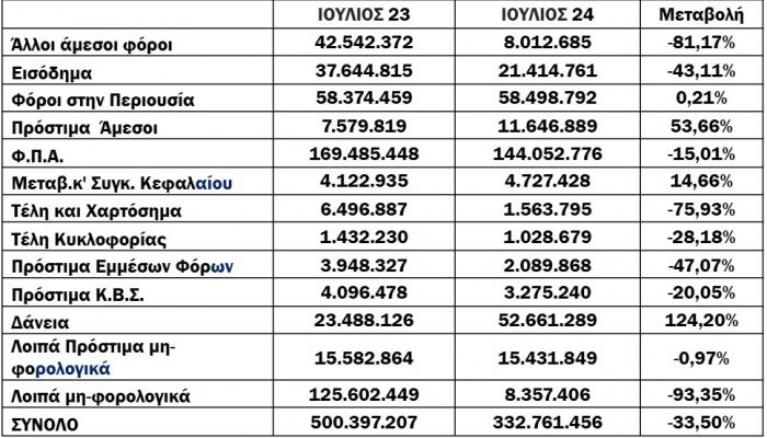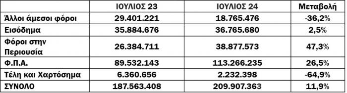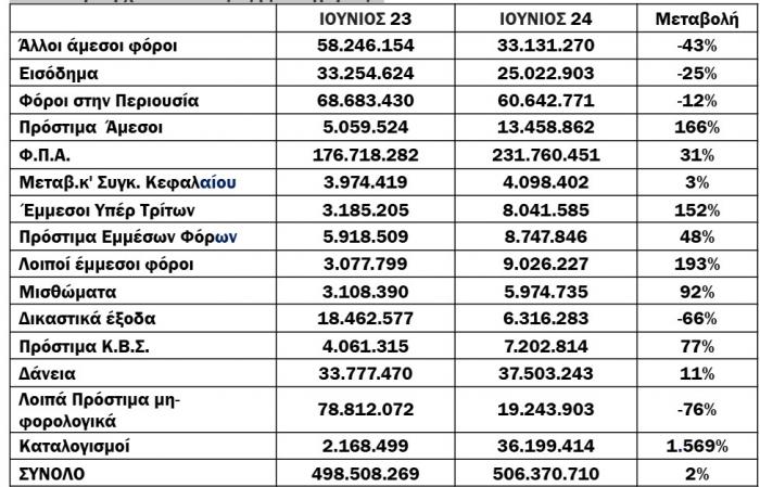 Για το 7μηνο, το νέο ληξιπρόθεσμο έφτασε τα 3,728 δισ., ενώ την ίδια περίοδο πέρυσι είχε φτάσει τα 3,461 δισ. (αύξηση κατά 7,7%). Για το μήνα αναφοράς (Ιούλιος) οι συνολικές εισπράξεις έναντι νέου ληξιπρόθεσμου (εκτός 10 ΜΦΚ) έφτασαν τα 224 εκατ., ενώ την αντίστοιχη περίοδο του 2023 έφτασαν τα 199 εκατ. (αύξηση κατά 12,5%).
