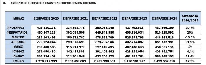 Αξίζει πάντως να σημειωθεί ότι οι συνολικές εισπράξεις έναντι ληξιπρόθεσμων οφειλών παρουσιάζουν στο 7μηνο αύξηση κατά 12,5% και προσέγγισαν τα 3,5 δισ. ευρώ.