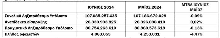Σε σχέση με την αντίστοιχη περίοδο του 2023, ο αριθμός των οφειλετών παρουσιάζει μείωση κατά 3% (4.063.053 πλήθος οφειλετών τον Ιούνιο του 2024 έναντι 4.184.515 το 2023).
