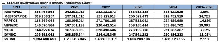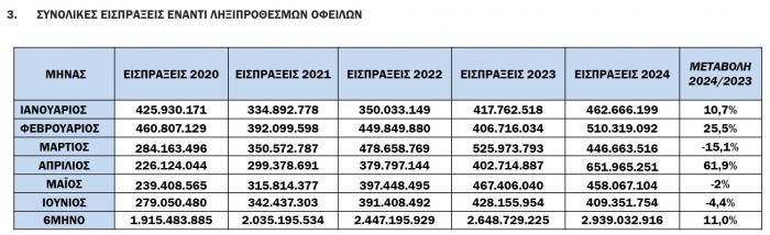 Για το 6μηνο, οι συνολικές εισπράξεις έναντι νέου ληξιπρόθεσμου (εκτός 10 ΜΦΚ) έφτασαν τα 1.198 εκατ., ενώ την ίδια περίοδο το 2023 είχαν φτάσει τα 960,3 εκατ. (αύξηση κατά 24,8%).