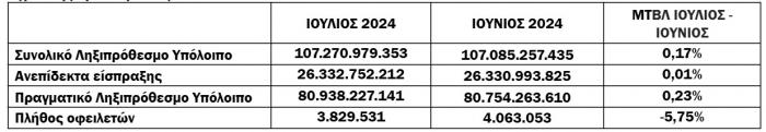 Για τον Ιούλιο, όπως τονίζει η ανεξάρτητη Αρχή, ο αριθμός των οφειλετών παρουσιάζει μείωση κατά 3,9% (3.829.531 πλήθος οφειλετών τον Ιούλιο του 2024 έναντι 3.984.904 τον Ιούνιο του 2023).