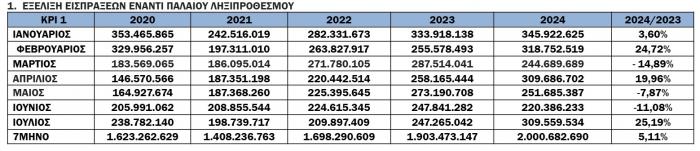 Για το 7μηνο, οι συνολικές εισπράξεις έναντι νέου ληξιπρόθεσμου (εκτός 10 ΜΦΚ) έφτασαν τα 1.422 εκατ. , ενώ την ίδια περίοδο το 2023 είχαν φτάσει τα 1.159,7 εκατ. (αύξηση κατά 22,6%).
