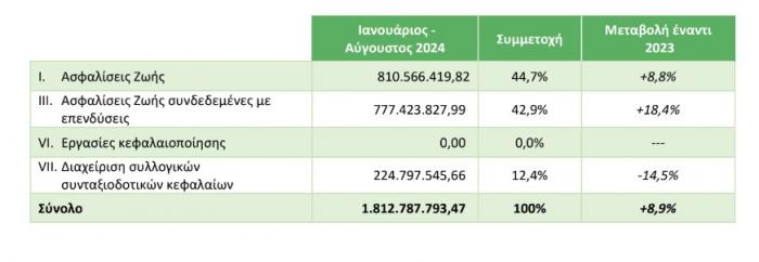 Αναλυτικά τον μήνα Αύγουστο, οι ασφαλίσεις ζωής ανήλθαν στα 80,09 εκατ. ευρώ, αυξημένες κατά 5,9% σε σχέση με τον Αύγουστο του 2023, ενώ οι ασφαλίσεις ζωής συνδεδεμένες με επενδύσεις σημείωσαν άνοδο 33,4% στα 63,6 εκατ. ευρώ, σε σχέση με τον Αύγουστο του 2023.