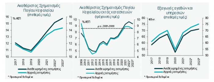 Κομβικό σημείο της αναθεώρησης ήταν η πολύ πιο ισχυρή, από την αρχικά εκτιμώμενη, δυναμική των επενδύσεων παγίου κεφαλαίου (ΑΣΠΚ) τα τελευταία χρόνια, η οποία έχει άμεση συσχέτιση με την παραγωγικότητα της οικονομίας, ειδικά μετά από μία δεκαετία πρωτοφανούς καθαρής αποεπένδυσης. Ειδικότερα, ο μέσος ετήσιος ρυθμός μεταβολής του ΑΣΠΚ, σε σταθερές τιμές, για την περίοδο 2021-2023 ανέρχεται σε +14,9% από +11,7%, εν μέρει λόγω της ανακατανομής των εκτιμώμενων επενδυτικών δαπανών από τα αποθέματα στον ΑΣΠΚ, αλλά και εξαιτίας της ακριβέστερης μέτρησης των τελικών κεφαλαιουχικών δαπανών.