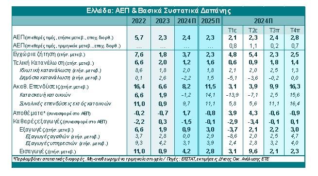 Η ενίσχυση των δαπανών του ΠΔΕ (συμπεριλαμβανομένου του ΤΑΑ) κατά το 2ο εξάμηνο του 2024, καθώς και η προβλεπόμενη επιτάχυνση των σχετικών εκταμιεύσεων σε ιστορικά υψηλά επίπεδα το 2025-2026 (σχεδόν 6,0% του ΑΕΠ κατά μέσο όρο ή €15 δισ. ετησίως, από περίπου 5,0% ή 12 €δισ. το 2023-2024), αναμένεται να ενισχύσουν περαιτέρω τη συνεισφορά των επενδύσεων. Επιπλέον, το υψηλότερο σημείο εκκίνησης για το διαθέσιμο εισόδημα των νοικοκυριών, σε συνδυασμό με την ισχυρή αγορά εργασίας αλλά και τις συνεχιζόμενες μισθολογικές προσαρμογές, αναμένεται να στηρίξουν την καταναλωτική εμπιστοσύνη και την ιδιωτική κατανάλωση συνδυαζόμενες και με την αναμενόμενη υποχώρηση του πληθωρισμού.