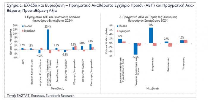 Εν κατακλείδι, ο ετήσιος πραγματικός ρυθμός μεγέθυνσης στην Ελλάδα το γ’ τρίμηνο 2024 και το 9μηνο Ιανουαρίου-Σεπτεμβρίου 2024 διατηρήθηκε σε ικανοποιητικά επίπεδα (οριακά υψηλότερος από την πρόβλεψη του Κρατικού Προϋπολογισμού 2025 για την ανάπτυξη του 2024), υπεραποδίδοντας έναντι της Ευρωζώνης και της ΕΕ-27. Από την πλευρά της ζήτησης, η μεταβολή των αποθεμάτων (υλικά και προμήθειες, έργα σε εξέλιξη, έτοιμα προϊόντα και εμπορεύματα για μεταπώληση) και η ιδιωτική κατανάλωση αποτέλεσαν τις βασικές συνιστώσες της ανάπτυξης, ενώ από την πλευρά της προσφοράς, η βιομηχανία και οι υπηρεσίες είχαν την υψηλότερη συνεισφορά στην αύξηση της παραγωγής. Στα αρνητικά στοιχεία των εθνικών λογαριασμών του 9μηνου Ιανουαρίου-Σεπτεμβρίου 2024 συγκαταλέγονται: πρώτον, η μείωση των εξαγωγών (λόγω της συνιστώσας των αγαθών) και η διεύρυνση του εμπορικού ελλείμματος, και δεύτερον, η ήπια άνοδος των επενδύσεων παγίων.
