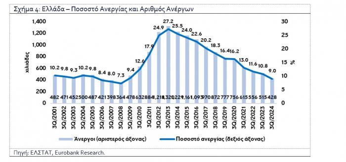 Σύμφωνα με τα πλέον πρόσφατα στοιχεία της Έρευνας Εργατικού Δυναμικού της ΕΛΣΤΑΤ, το γ’ τρίμηνο 2024 το ποσοστό ανεργίας στην Ελλάδα κατήλθε στο ίδιο επίπεδο με το β΄ τρίμηνο 2009, δηλαδή στο 9,0%, από 10,8% το γ’ τρίμηνο 2023. Την ίδια περίοδο ο αριθμός των ανέργων περιορίστηκε κατά 86,2 χιλ. στους 428,4 χιλ., δηλαδή στο χαμηλότερο επίπεδο από το β’ τρίμηνο 2009 (455,6 χιλ.). Ο αριθμός των απασχολουμένων αυξήθηκε σε ετήσια βάση κατά 67,7 χιλ. στους 4.323,9 χιλ. αλλά υπολείπεται σημαντικά (κατά 315,7 χιλ. άτομα) συγκριτικά με την κορυφή του γ’ τριμήνου 2008 (4.639,6 χιλ.). Παράλληλα, το ποσοστό συμμετοχής του πληθυσμού στο εργατικό δυναμικό κατήλθε οριακά, στο 52,7% από 52,8% ένα έτος νωρίτερα, αλλά το μέσο ποσοστό του 9μηνου Ιανουαρίου-Σεπτεμβρίου 2024 (52,8%) ήταν υψηλότερο συγκριτικά με το αντίστοιχο ποσοστό του 2023 (52,3%), παραμένοντας όμως από τα χαμηλότερα στην ΕΕ-27.
