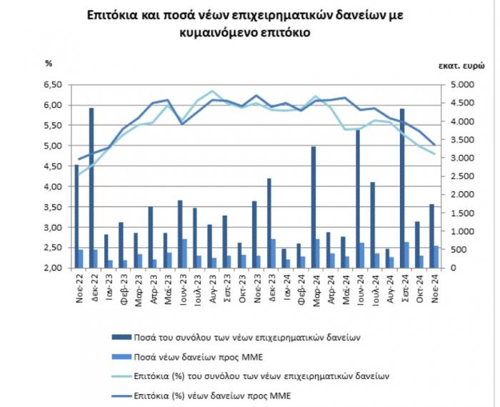 Το μέσο επιτόκιο των νέων επιχειρηματικών δανείων με συγκεκριμένη διάρκεια και κυμαινόμενο επιτόκιο μειώθηκε κατά 17 μονάδες βάσης και διαμορφώθηκε στο 4,81%. Το μέσο επιτόκιο των δανείων τακτής λήξης με κυμαινόμενο επιτόκιο προς μικρομεσαίες επιχειρήσεις (ΜΜΕ) μειώθηκε κατά 34 μονάδες βάσης και διαμορφώθηκε στο 5,02%.