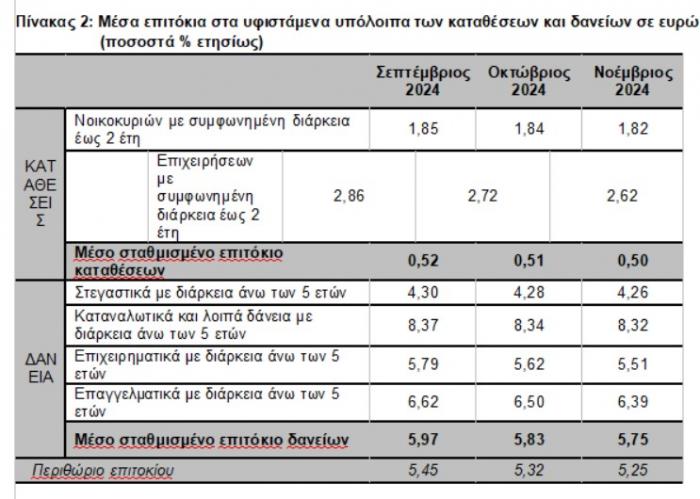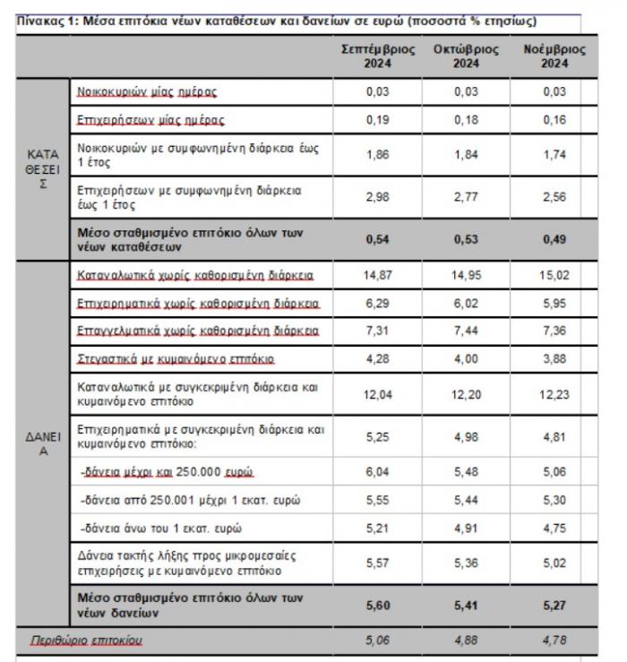 - Το Νοέμβριο του 2024, το μέσο σταθμισμένο επιτόκιο των νέων καταθέσεων μειώθηκε στο 0,49%, ενώ το αντίστοιχο επιτόκιο των νέων δανείων μειώθηκε στο 5,27%.