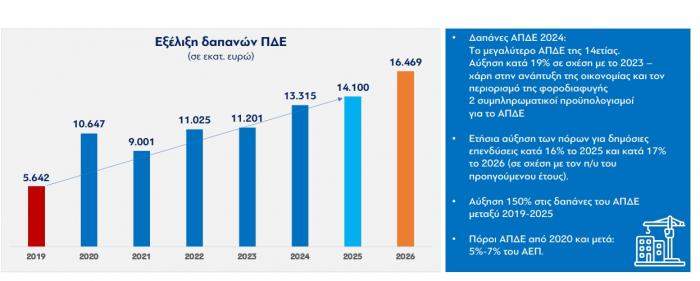 Ο υπουργός Εθνικής Οικονομίας και Οικονομικών, κ. Κωστή Χατζηδάκης, σημείωσε ότι το Πρόγραμμα Δημοσίων Επενδύσεων (ΠΔΕ) εμφάνισε το 2024 αύξηση 150% σε σύγκριση με το 2019 φθάνοντας στα 13,315 δισ. ευρώ, ενώ αναμένεται ότι φέτος θα ενισχυθεί περαιτέρω κατά 16%. Το 2024 σε σύγκριση με το προηγούμενο έτος η αύξησή του ήταν 19% και διαμορφώθηκε στο 7% του ΑΕΠ.
