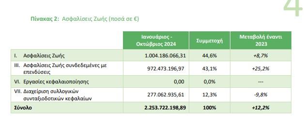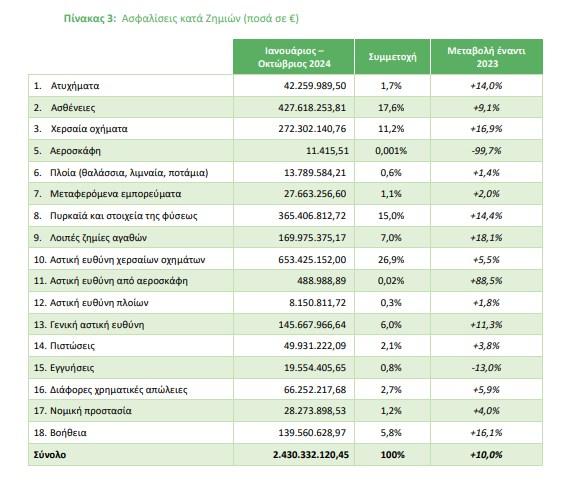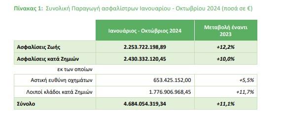 Από τις 48 ασφαλιστικές επιχειρήσεις, οι 26 δραστηριοποιήθηκαν στην Ελλάδα με την μορφή της Ανώνυμης Ασφαλιστικής Εταιρίας, 1 με τη μορφή του αλληλασφαλιστικού συνεταιρισμού, 15 ως Υποκαταστήματα αλλοδαπής ασφαλιστικής και 6 ευρωπαϊκές ασφαλιστικές δραστηριοποιήθηκαν με καθεστώς ελεύθερης παροχής υπηρεσιών. Σύμφωνα με τα στοιχεία αυτά (κατόπιν προσαρμογής των δεδομένων του προηγούμενου χρονικού διαστήματος με νεότερες απαντήσεις), από τη σύγκριση των δηλώσεων παραγωγής ασφαλίστρων των μηνών Ιανουαρίου – Οκτωβρίου 2024 των ανωτέρω επιχειρήσεων με τις αντίστοιχες της ίδιας περιόδου για το 2023 των ιδίων επιχειρήσεων, προκύπτουν τα παρακάτω: