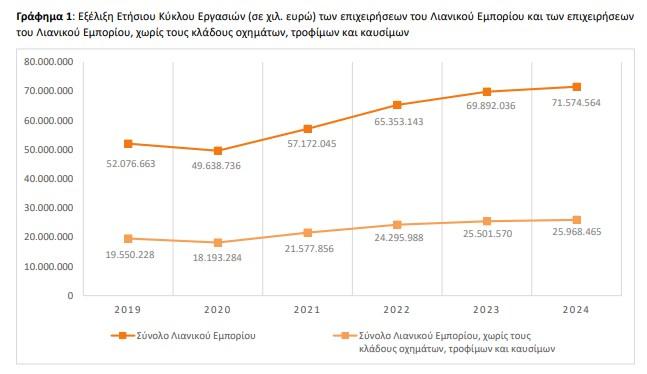 Για τις επιχειρήσεις του λιανικού εμπορίου, χωρίς τους κλάδους οχημάτων, τροφίμων και καυσίμων, ο κύκλος εργασιών το δ' τρίμηνο 2024 ανήλθε σε 7,23 δισ. ευρώ, σημειώνοντας αύξηση 0,6% σε σχέση με το δ' τρίμηνο 2023, όπου είχε διαμορφωθεί σε 7,19 δισ. ευρώ και αύξηση 6,1% σε σχέση με το γ' τρίμηνο του 2024 που είχε διαμορφωθεί σε 6,82 δισ. ευρώ.
