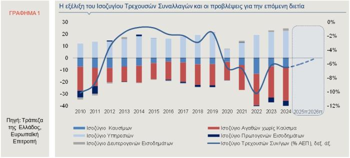 Σύμφωνα με τις προβλέψεις της Τράπεζας της Ελλάδος, το έλλειμμα του ΙΤΣ αναμένεται να υποχωρήσει στο 6% του ΑΕΠ το 2025 και στο 5,2% του ΑΕΠ το 2026, έναντι εκτίμησης για 6,5% του ΑΕΠ το 2024 .