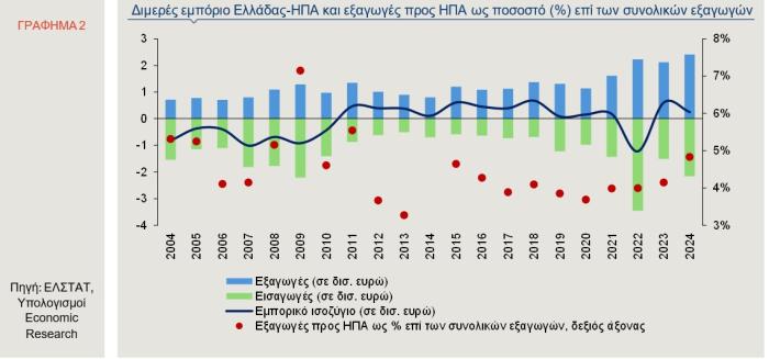 Συγκεκριμένα, η Γερμανία και η Ιταλία διατηρούν σημαντικά εμπορικά πλεονάσματα με τις ΗΠΑ, τα οποία για το 2024 ανήλθαν σε 92 δισ. και 39 δισ. αντίστοιχα, αντιπροσωπεύοντας μαζί με το εμπορικό πλεόνασμα της Ιρλανδίας (51 δισ.) περίπου το 92% του συνολικού εμπορικού πλεονάσματος της ΕΕ-27 έναντι των ΗΠΑ (198 δισ.). Επιπρόσθετα, το 10,5% των ελληνικών εξαγωγών αγαθών κατευθύνθηκε το 2024 στην Ιταλία και το 7,1% στη Γερμανία, με τις δύο χώρες να αποτελούν διαχρονικά από τις κυριότερες τουριστικές αγορές για τη χώρα μας. Κατά συνέπεια, ενδεχόμενη επιβράδυνση της οικονομικής δραστηριότητας στις χώρες αυτές αναμένεται να επηρεάσει αρνητικά τις ελληνικές εξαγωγές αγαθών και υπηρεσιών.