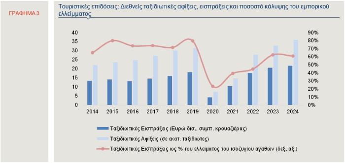 Συγκεκριμένα, παρά τη μικρή υποχώρηση το 2024, έχουν διπλασιαστεί σε σύγκριση με την προηγούμενη δεκαετία, γεγονός που οφείλεται τόσο στις εξαγωγές καυσίμων, όσο και στις εξαγωγές αγαθών εκτός καυσίμων. Παράλληλα, η συνεισφορά του τουρισμού στον περιορισμό του ελλείμματος του ΙΤΣ είναι σημαντική, με τις ταξιδιωτικές εισπράξεις να αυξάνονται κατά 5,4% το 2024, καλύπτοντας το έλλειμμα του εμπορικού ισοζυγίου κατά 61%. Το τελευταίο αυτό ποσοστό, το οποίο μειώθηκε σημαντικά κατά τη διάρκεια της πανδημικής και ενεργειακής κρίσης, έχει ανακάμψει σημαντικά, μολονότι δεν έχει επανέλθει στα προ της πανδημίας επίπεδα (Γράφημα 3).