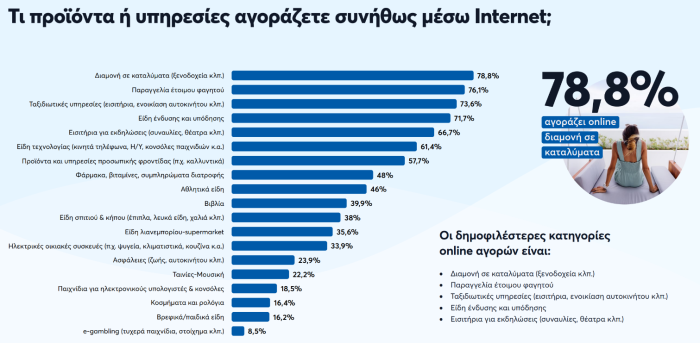 Οι πιο δημοφιλείς αγορές σε προϊόντα και υπηρεσίες είναι: Η διαμονή σε καταλύματα (ξενοδοχεία κ,α), οι παραγγελίες έτοιμου φαγητού και οι ταξιδιωτικές υπηρεσίες όπως εισιτήρια, ενοικίαση αυτοκινήτου κ.λπ.