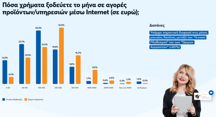 Οι «ώριμοι αγοραστές» καθορίζουν την στρατηγική. Αυτή η ομάδα καταναλωτών ξοδεύει έως και 80% περισσότερα σε online αγορές Το 32% των ώριμων χρηστών καταναλώνει μεταξύ 250-500 ευρώ το μήνα και το 30,4% του γενικού πληθυσμού μεταξύ 100-250 ευρώ.