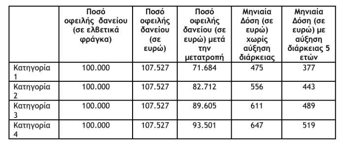 Η βεβαίωση κατάταξης σε μία εκ των τριών Κατηγοριών καθορίζει τους ευνοϊκούς όρους μετατροπής δανείων ελβετικού φράγκου σε ευρώ ως εξής: