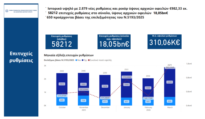 Ο εξωδικαστικός μηχανισμός κατέγραψε τον Μάρτιο την υψηλότερη επίδοση από την έναρξη λειτουργίας του, καθώς ολοκληρώθηκαν 2.879 ρυθμίσεις οφειλών συνολικού ύψους 982 εκατ. ευρώ.