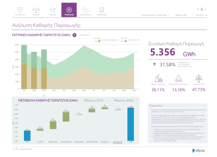 Η συνολική καθαρή παραγωγή έφτασε τις 5.356 GWh, αυξημένη κατά 31,58% σε ετήσια βάση, εξέλιξη που συνιστά μία από τις πιο ισχυρές μηνιαίες επιδόσεις των τελευταίων ετών.