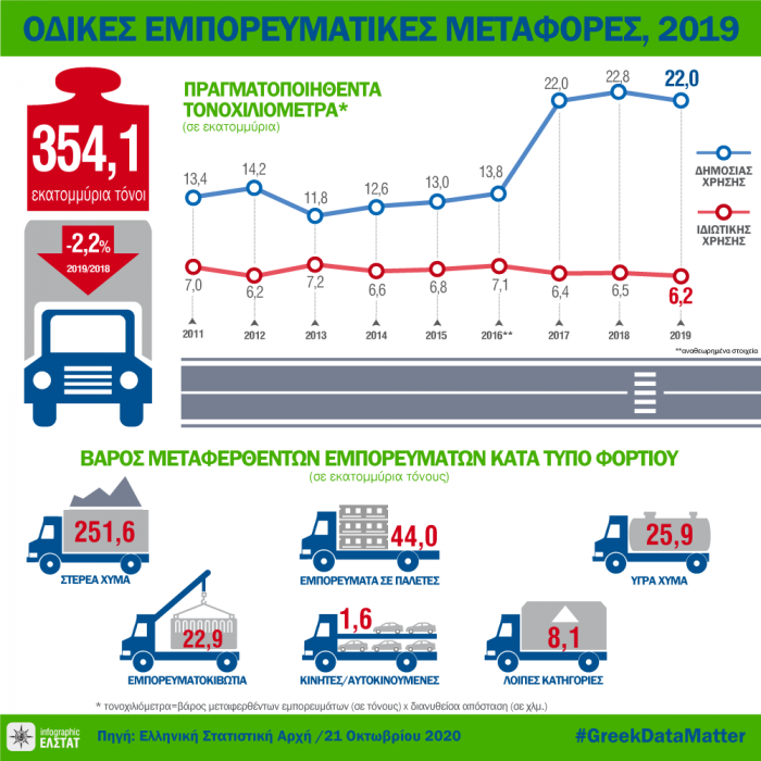 Ειδικότερα, το βάρος των φορτίων που διακινήθηκαν με φορτηγά ιδιωτικής χρήσεως ανήλθε σε 259.380,8 χιλιάδες τόνους σημειώνοντας μείωση 2,7% σε σύγκριση με το 2018 και τα τονοχιλιόμετρα σε 6.207.170,2 χιλ., σημειώνοντας μείωση 4%. Το βάρος των φορτίων που διακινήθηκαν με φορτηγά δημοσίας χρήσεως ανήλθε σε 94.700,8 χιλ. τόνους σημειώνοντας μείωση 0,8% και τα τονοχιλιόμετρα σε 21.989.785,0 χιλ. σημειώνοντας μείωση 3,6%.