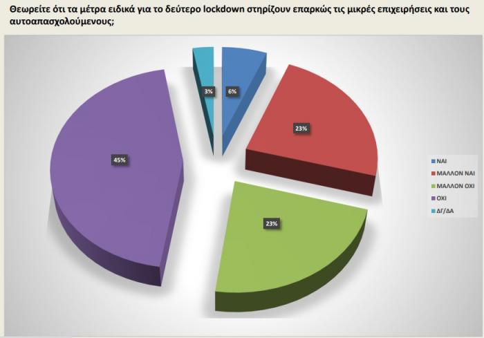 Μόνο το 29% των επιχειρήσεων θεωρούν ότι βοήθησαν πολύ ή αρκετά τα μέτρα που έχουν ληφθεί από την κυβέρνηση κατά την διάρκεια της πανδημίας. Λίγο δηλώνει το 44% και καθόλου το 25%. Ειδικά για τα μέτρα κατά την διάρκεια του δεύτερου lock down ικανοποίηση δηλώνει το 29%, με το 68% να δηλώνει μη ικανοποίηση. Το ποσοστό αυτό στο Εμπόριο φτάνει το 72,1%.