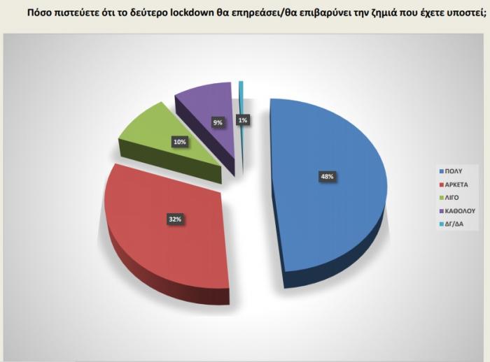 Το 86% των επιχειρήσεων έχουν υποστεί οικονομική ζημιά από την αρχή της πανδημίας μέχρι σήμερα, ενώ το 80% αναμένουν η ζημιά αυτή θα επιβαρυνθεί από το δεύτερο lockdown. Ιδιαίτερα άσχημη φαίνεται η κατάσταση στην εστίαση με τα ποσοστά να φτάνουν το 99% και 94,8% αντίστοιχα. Ιδιαίτερα δε φαίνεται να πλήττονται οι επιχειρήσεις που απασχολούν 1-6 εργαζομένους αφού το 91,8% από αυτές δηλώνει σοβαρές ζημιές σε αυτή την περίοδο.