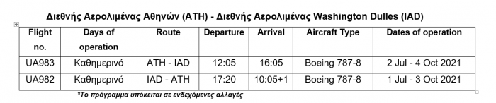 Η νέα καθημερινή, απευθείας, θερινή πτήση πραγματοποιείται με το υπερσύγχρονο Boeing 787-8 Dreamliner αεροσκάφος, εξοπλισμένο με τα βραβευμένα United PolarisSM business class cabin και United Premium PlusSM θέσεις, Η νέα καθημερινή πτήση είναι ιστορικά η πρώτη που πραγματοποιείται μεταξύ της Αθήνας και της Washington D.C, και προστίθεται στο υπάρχον καθημερινό θερινό πρόγραμμα της United που περιλαμβάνει την πτήση από την Αθήνα προς τον κόμβο της εταιρείας στη Νέα Υόρκη/Newark, η οποία ξεκίνησε πάλι στις 3 Ιουνίου.