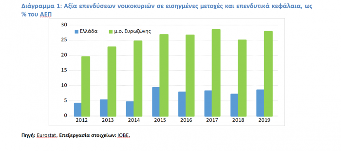 Σε αυτό το πλαίσιο, σε σύγκριση με την υπόλοιπη Ευρώπη, υπάρχει σημαντικό περιθώριο ανάπτυξης της εγχώριας κεφαλαιαγοράς. Στην πλευρά της ζήτησης, τα ελληνικά νοικοκυριά συμμετέχουν σε μικρό μόνο βαθμό σε επενδύσεις στην κεφαλαιαγορά συγκριτικά με το μέσο ευρωπαϊκό νοικοκυριό - η μέση αξία των επενδύσεων νοικοκυριών σε εισηγμένες μετοχές και επενδυτικά κεφάλαια περιορίζεται σε 8,5% του ΑΕΠ στην Ελλάδα το 2019, έναντι 27,8% κατά μέσο όρο στην Ευρωζώνη (Διάγραμμα 1).